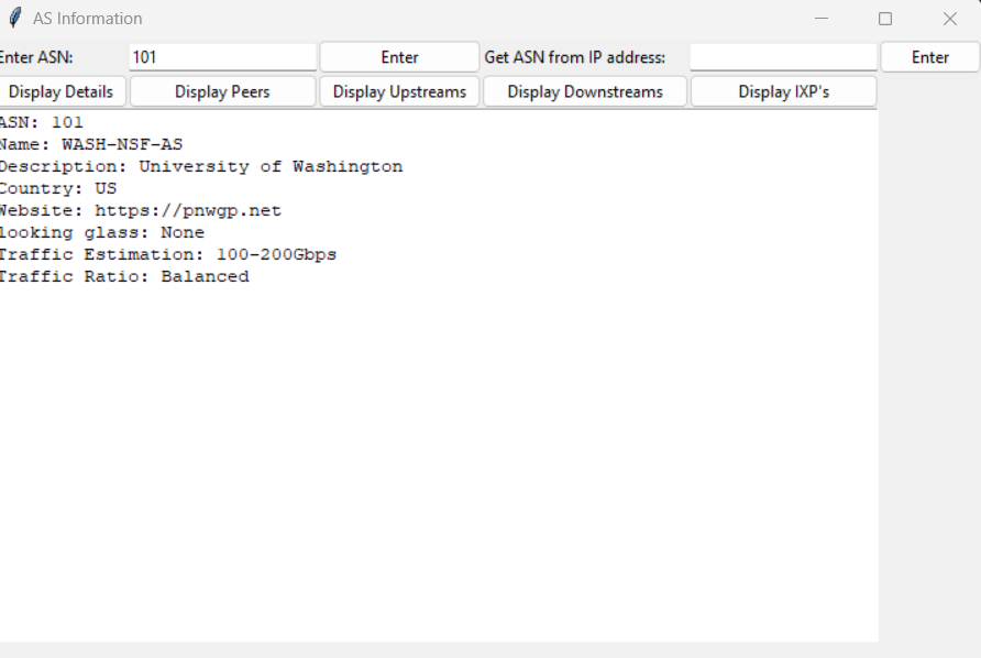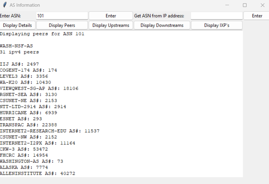 The development of BGP python AS lookup was inspired by a repository found on Cisco Developer (pyjoeypy06). I thought that the code was interesting and learned of the API it was using to pull the BGP data from the internet. The API seemed underutilized so I set out to make more use of it. The app works by appending the entered ASN to a link to the api, which then responds with JSON data. It then parses through the JSON data for the specific information each section of information may need for the given AS. The information is stored in object variables so the app can store more than one AS’s data. It uses string concatenation to display the result in plaintext format. The project was built in Python and the UI was built using TKinter (a built in python graphics library).